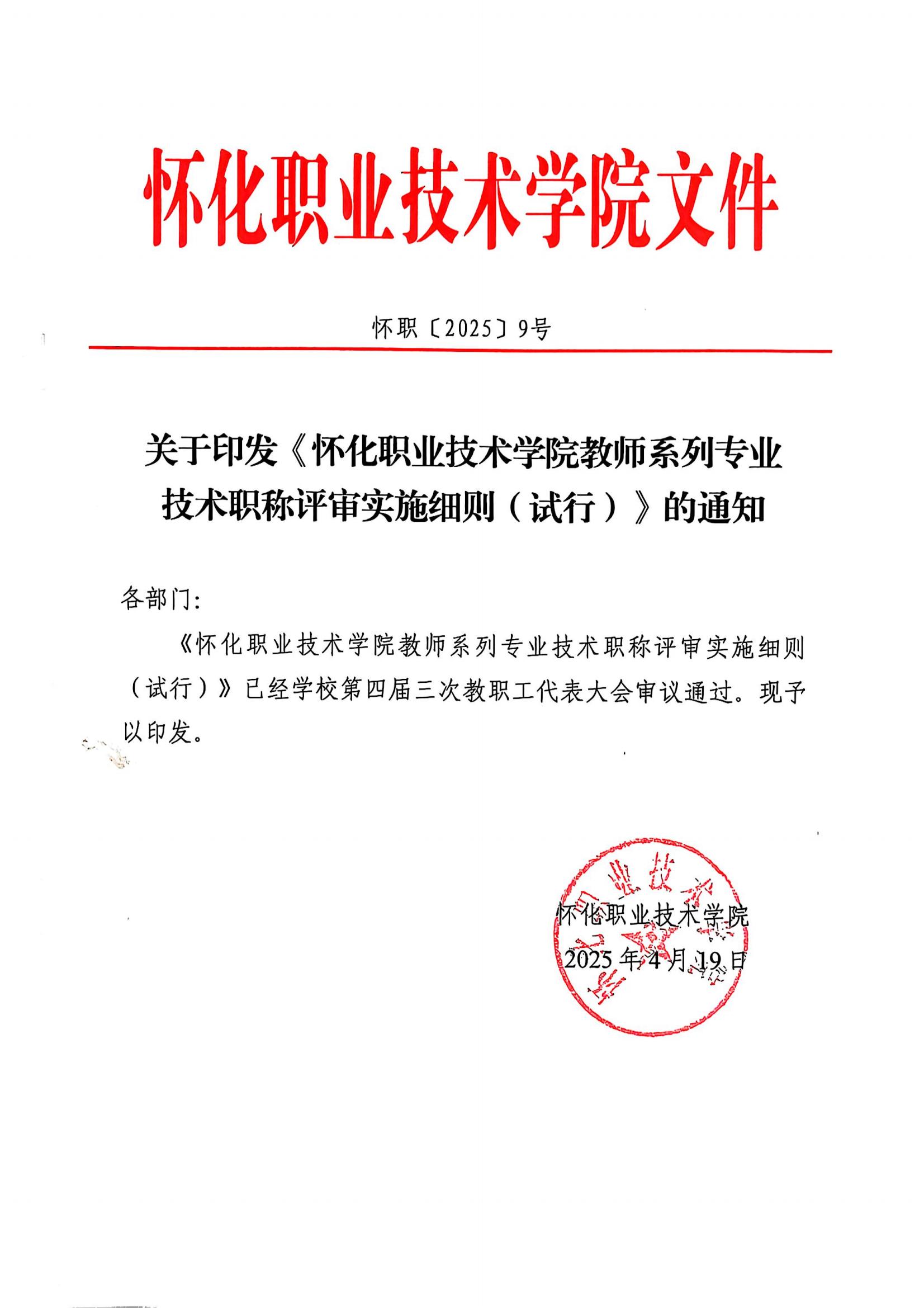 2025年,《怀化职业技术学院教师系列专业技术职称评审实施细则(试行)》出台
