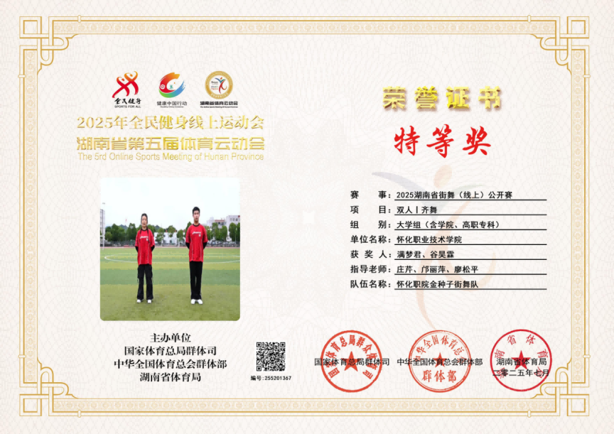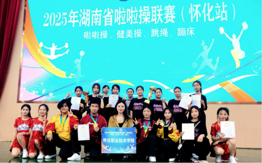 2025年湖南省街舞公开赛(线上)中,我校庄芹、邝丽萍、廖松平、陈骋、江波老师指导的三个项目,荣获特等奖1个、一等奖2个。2025年湖南省啦啦操联赛(怀化站)中,由庄芹、王玥、邝丽萍老师指导的四个项目,荣获一等奖3个,二等奖1个。