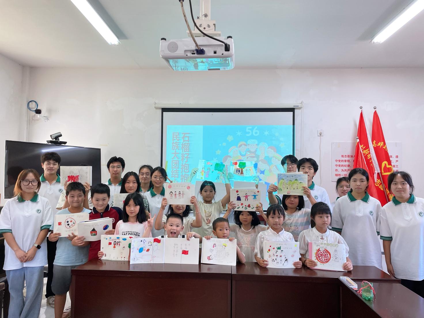 “沧海桑田繁花似锦,丹心一片寄东风。五十六个民族一家亲。心手相牵同心筑梦……”,一阵阵欢快的歌声从教室传出。在“石榴籽抱抱——民族大团结小课堂”上,一张张以“民族团结一家亲”为主题的画卷尽显孩子们对祖国繁荣昌盛的美好祝福,以及对中华民族一家亲、同心共筑中国梦的美好愿景。实践团队创新普通话推广形式,开设“推普+美术”“推普+音乐”“推普+情景剧”等一系列普通话学习课程,从普通话发音、表达应用等方面入手,提升孩子们国家通用语言文字应用能力和文化素质,致力于将推普之风吹到祖国最需要的地方。